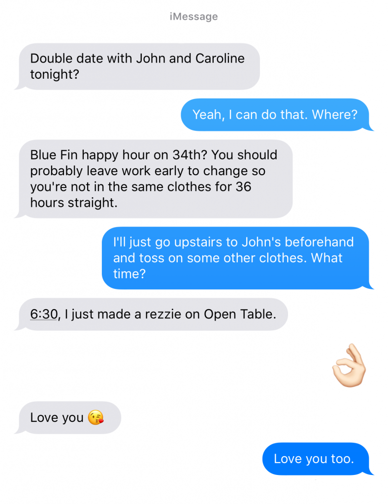 It wasn’t any sort of novel conversation. In fact, it was the exact conversation you’d expect them to have after a night of Cabernet, then martinis, then more Cabernet before making up.